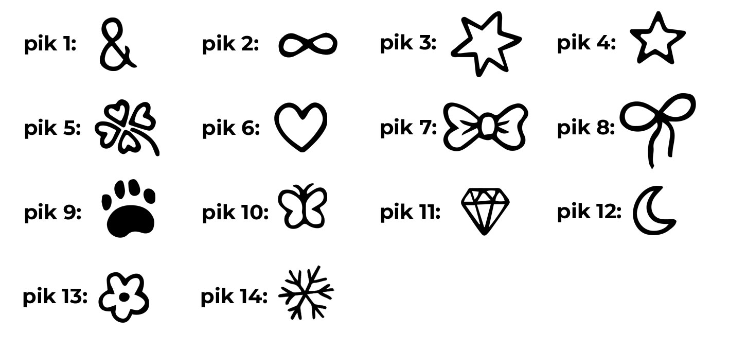 - różne piktogramy (np. serce, gwiazdka, łapka, koniczyna i inne)