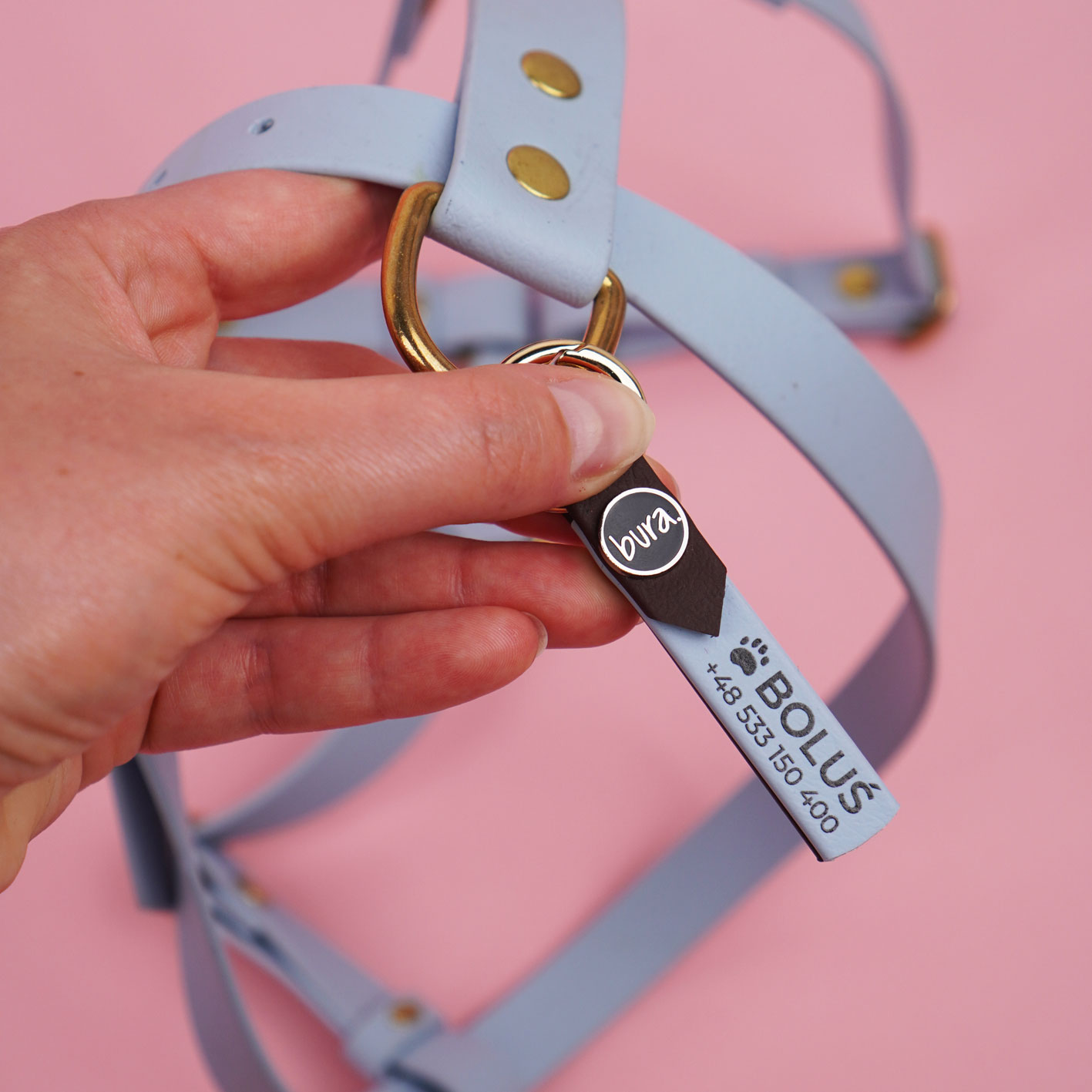 Okrągły karabińczyk umożliwia łatwe dopięcie adresówki do obroży lub szelek – bez konieczności zdejmowania akcesoriów.