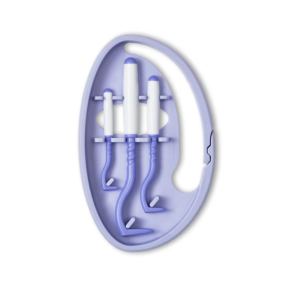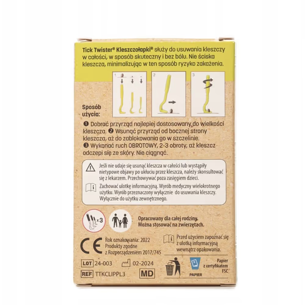 Zestaw zawiera trzy haczyki w różnych rozmiarach, co pozwala na skuteczne usuwanie zarówno małych, jak i większych kleszczy. Dzięki praktycznemu opakowaniu typu Clip Box z karabińczykiem, kleszczołapki można przypiąć do kluczy, plecaka czy paska.