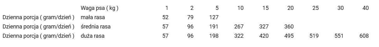 Zalecana ilość karmy ma charakter orientacyjny i zależy od wieku, aktywności, rasy i potrzeb indywidualnych każdego psa. Pamiętaj, aby zapewnić psu stały dostęp do świeżej wody.