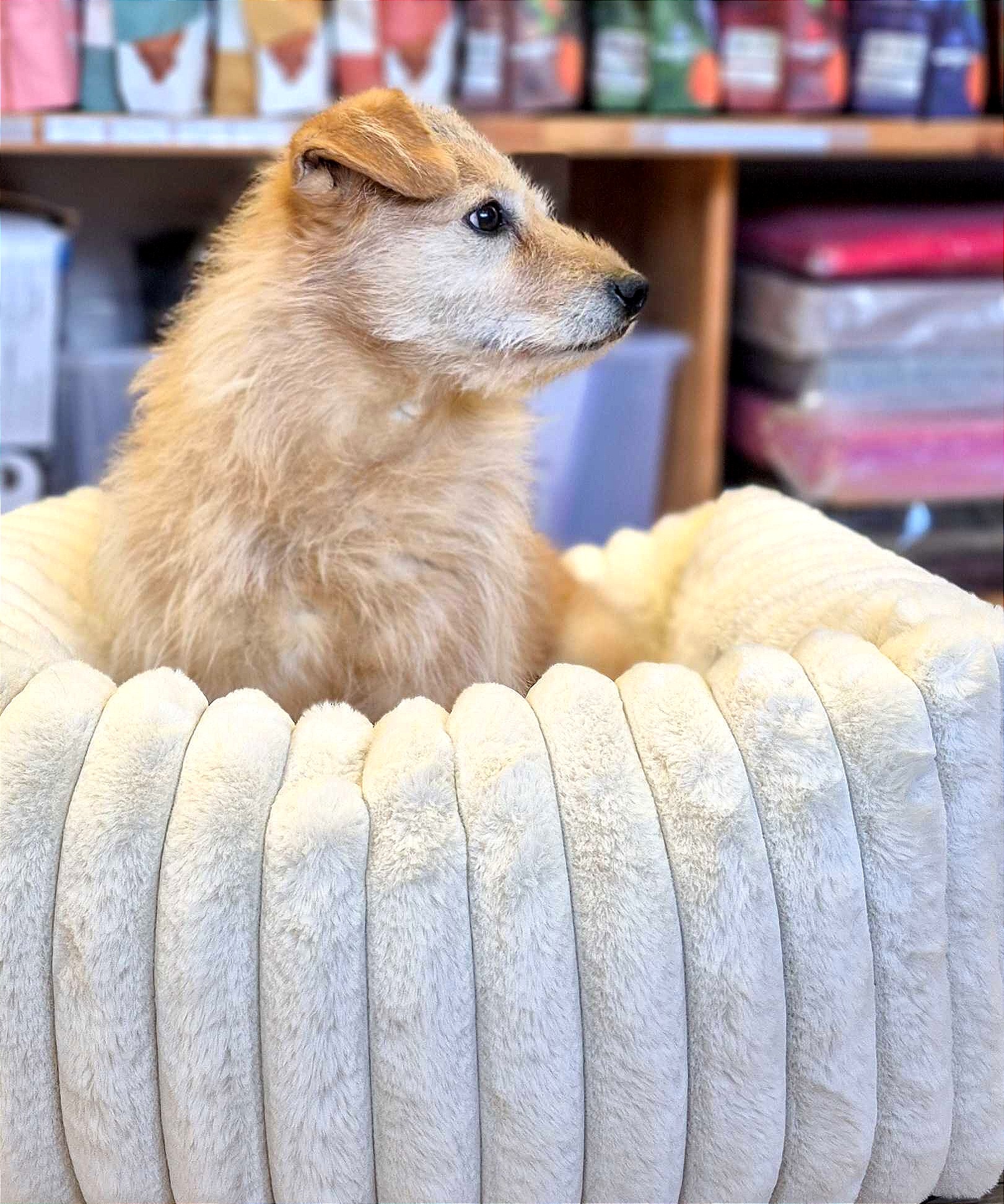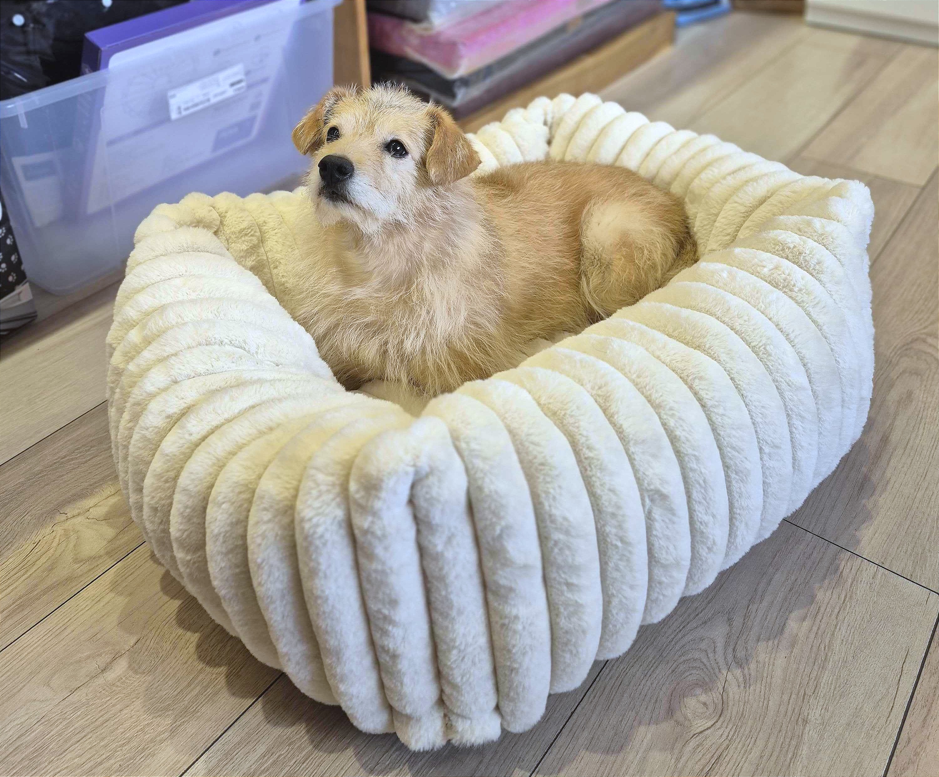 Subtelny, kremowy odcień oraz wyjątkowa, prążkowana struktura materiału sprawiają, że legowisko doskonale komponuje się z wnętrzami w stylu nowoczesnym, skandynawskim czy minimalistycznym. To nie tylko miejsce odpoczynku, ale również stylowy element aranżacji przestrzeni.