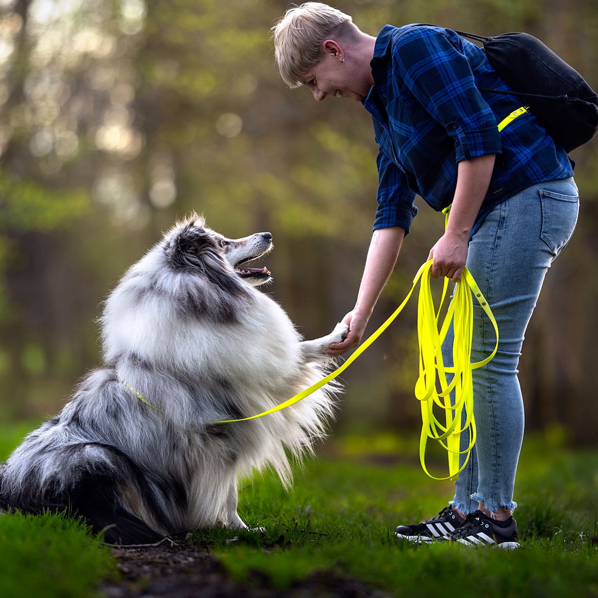 Neonowy żółty to jeden z najbardziej widocznych kolorów, jaki możesz wybrać dla linki treningowej. Intensywny, świetlisty i wyraźny – zapewnia maksymalną widoczność psa w każdych warunkach, niezależnie od pory dnia czy terenu.
