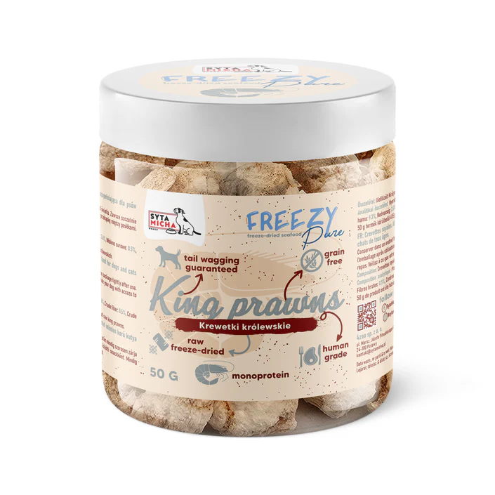 Liofilizowane krewetki królewskie dla psa Syta Micha FREEZY Pure to naturalny, jednoskładnikowy przysmak o wysokiej zawartości białka i wyjątkowej smakowitości. Dzięki procesowi liofilizacji zachowuje cenne wartości odżywcze, naturalny aromat i lekką strukturę. Idealny dla psów aktywnych, wrażliwych oraz wymagających – bez konserwantów, zbóż, glutenu i sztucznych dodatków.