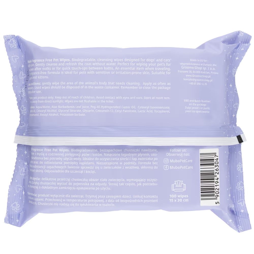 Mubo Fragrance Free Pet Wipes to bezzapachowe chusteczki nawilżane dla psa i kota, stworzone z myślą o wrażliwej skórze i delikatnym węchu zwierząt. Zawierają aloes, który nawilża, koi i wspiera regenerację skóry. Skutecznie oczyszczają sierść i skórę bez użycia wody. Biodegradowalne, wykonane w 100% z wiskozy, idealne do codziennej pielęgnacji w domu i w podróży.