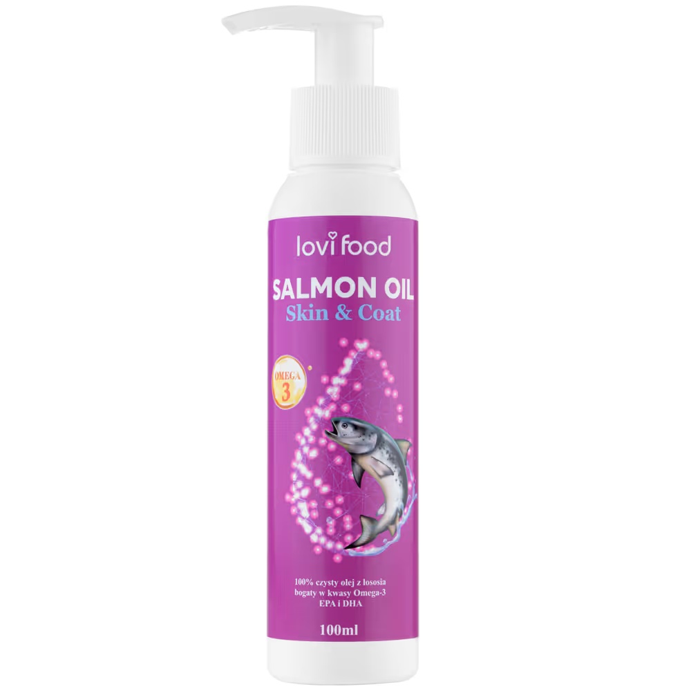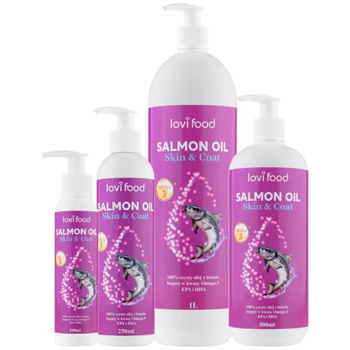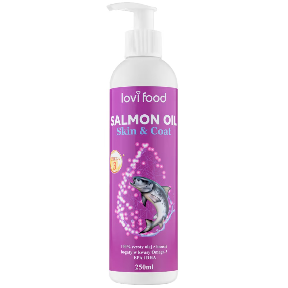 Lovi Food Salmon Oil to 100% naturalny olej z łososia dla psa i kota, bogaty w kwasy Omega-3, EPA i DHA. Wspiera zdrową skórę, lśniącą sierść, odporność oraz prawidłową pracę serca i stawów. Idealny jako codzienny suplement diety, również przy diecie BARF.