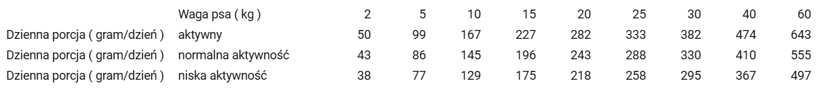 Zalecana ilość karmy ma charakter orientacyjny i zależy od wieku, aktywności, rasy i potrzeb indywidualnych każdego psa. Pamiętaj, aby zapewnić psu stały dostęp do świeżej wody.