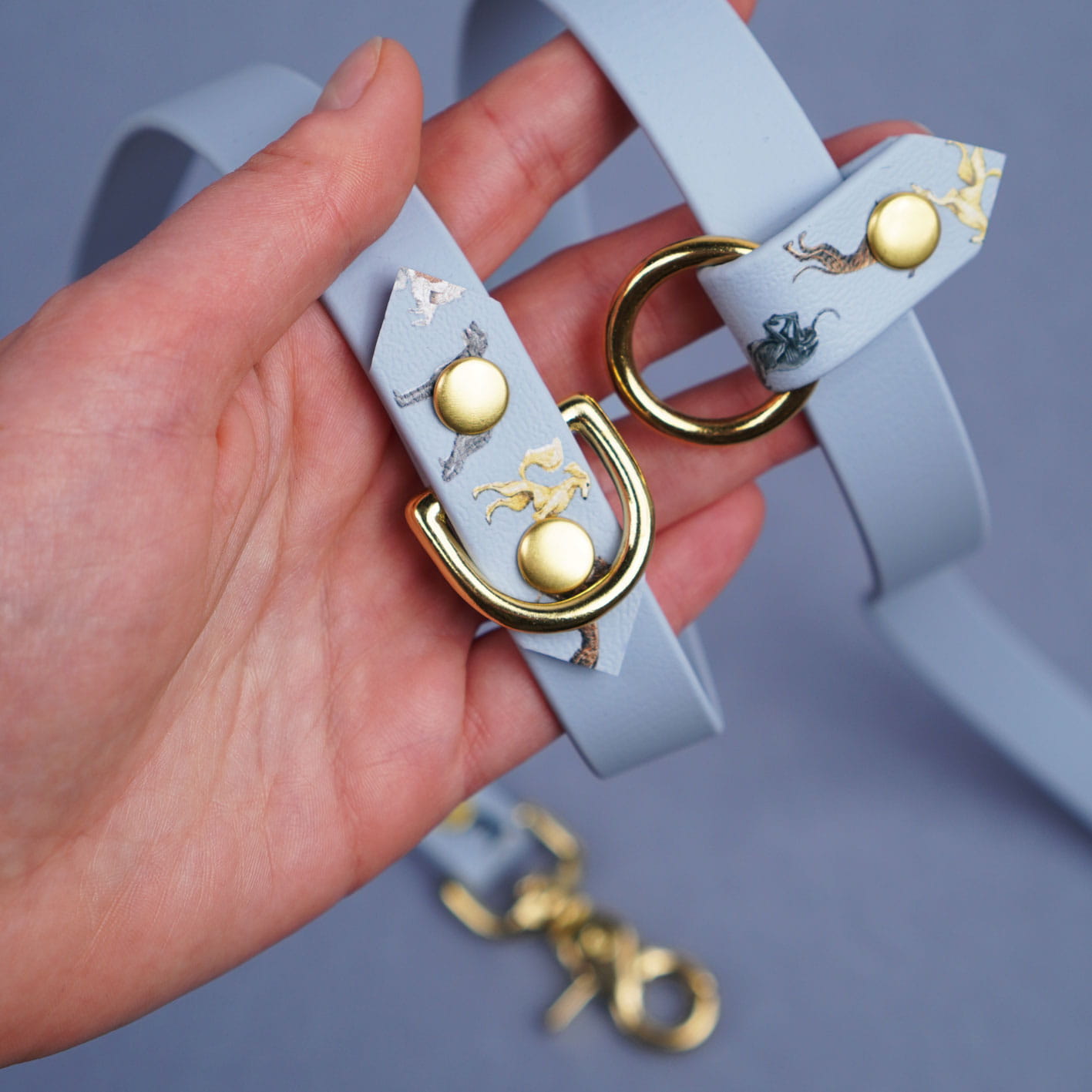 Smycz przepinana multifunkcyjna dla psa BioThane® kolor pastelowy niebieski marki BURA z autorskim wzorem Charty to połączenie funkcjonalności, trwałości i wyjątkowego designu. Wodoodporna, regulowana, z opcją hands-free i rączką „traffic” – idealna do codziennych spacerów, treningu i aktywności outdoorowych.