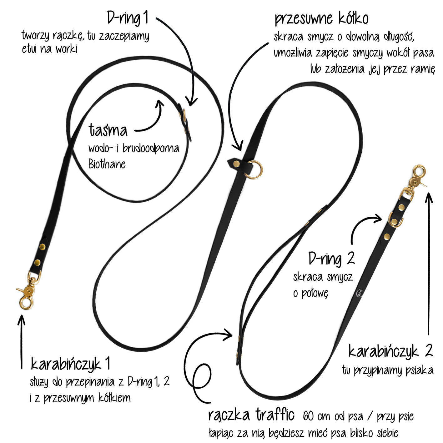Smycz wykonywana jest ręcznie na zamówienie. Wybór niestandardowej długości lub okuć oznacza personalizację produktu, która zgodnie z obowiązującymi przepisami nie podlega zwrotowi.