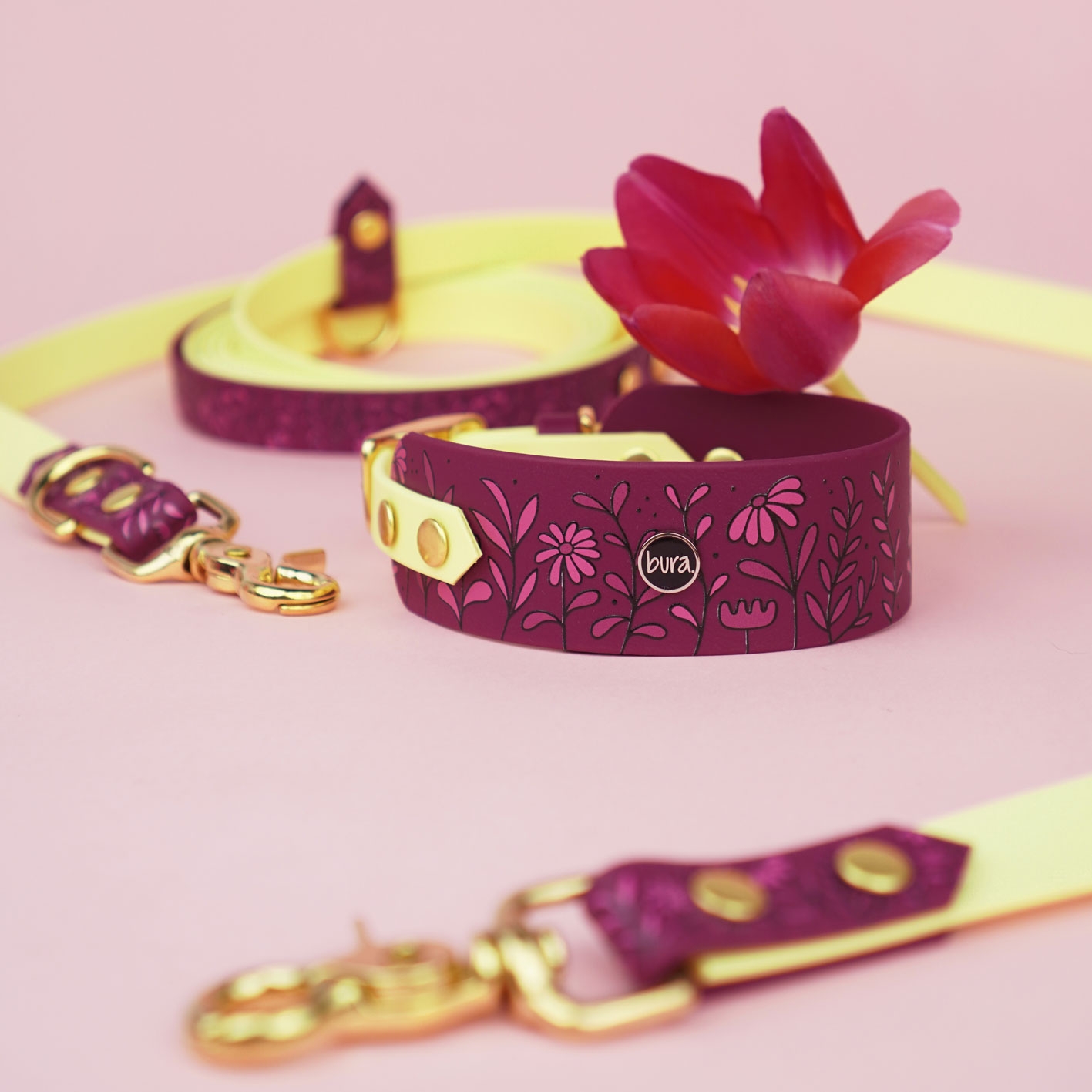 Smycz przepinana multifunkcyjna dla psa BioThane® BURA z autorskim wzorem Łąka to połączenie funkcjonalności, trwałości i wyjątkowego designu. Wodoodporna, regulowana, z opcją hands-free i rączką „traffic” – idealna do codziennych spacerów, treningu i aktywności outdoorowych. Dostępna w trzech wariantach kolorystycznych: bordowym, pastelowym żółtym i pudrowym różu.