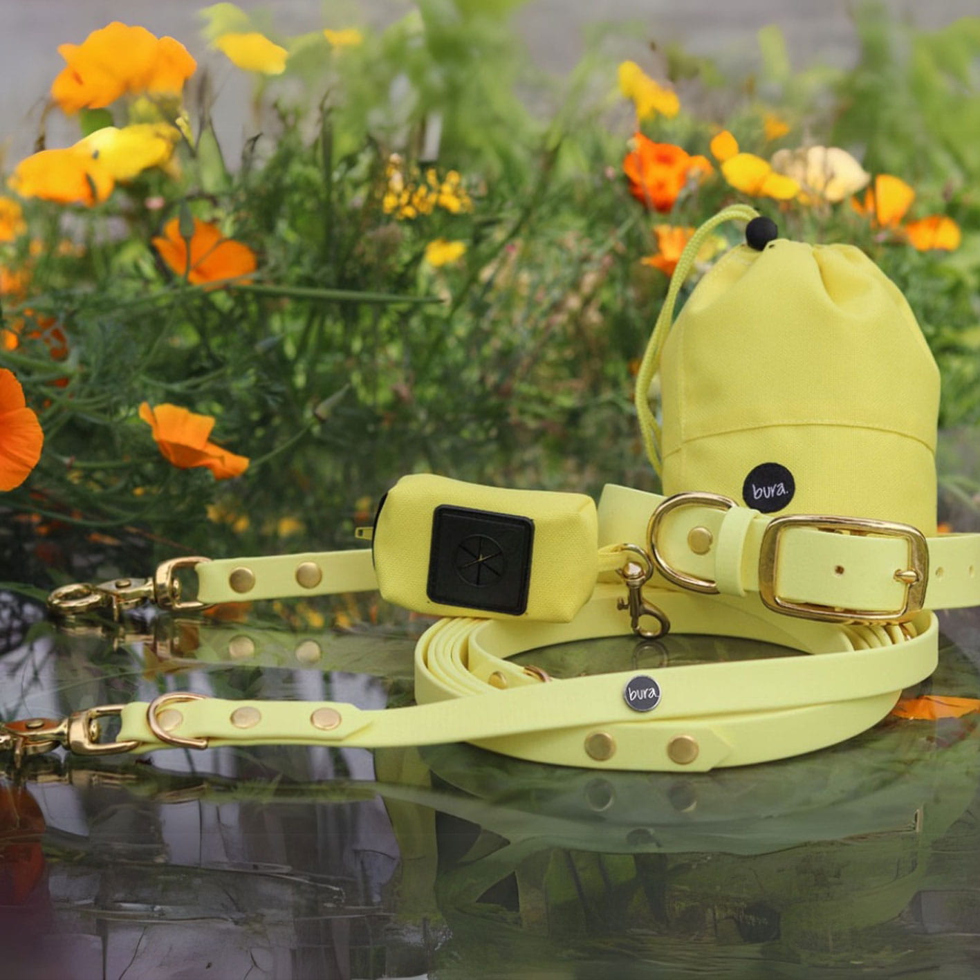 Wielofunkcyjna smycz przepinana dla psa z oryginalnego tworzywa Biothane® marki Bura w kolorze pastelowym żółtym. Ręcznie wykonana w Polsce, wodoodporna, trwała i wygodna w użytkowaniu. Idealna do miejskich spacerów i aktywności w terenie. Możliwość noszenia hands-free, regulacji długości oraz personalizacji okuć i taśmy.