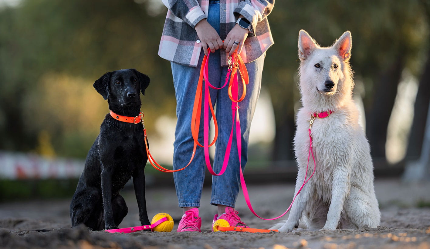 Dwa karabińczyki – pozwalają prowadzić dwa psy jednocześnie lub wygodnie przepinać smycz do różnych punktów.