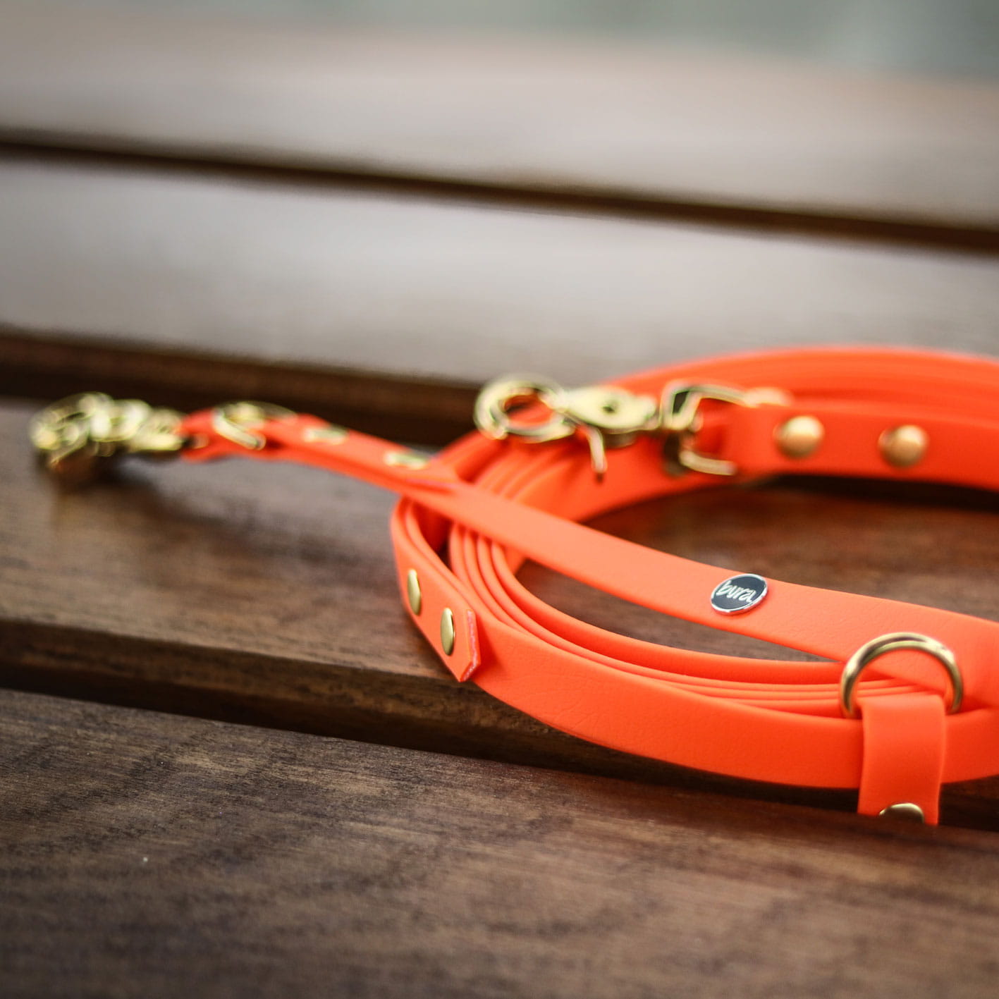 Wielofunkcyjna smycz przepinana dla psa z oryginalnego tworzywa Biothane® marki Bura w kolorze pomarańczowym. Ręcznie wykonana w Polsce, wodoodporna, trwała i wygodna w użytkowaniu. Idealna do miejskich spacerów i aktywności w terenie. Możliwość noszenia hands-free, regulacji długości oraz personalizacji okuć i taśmy.