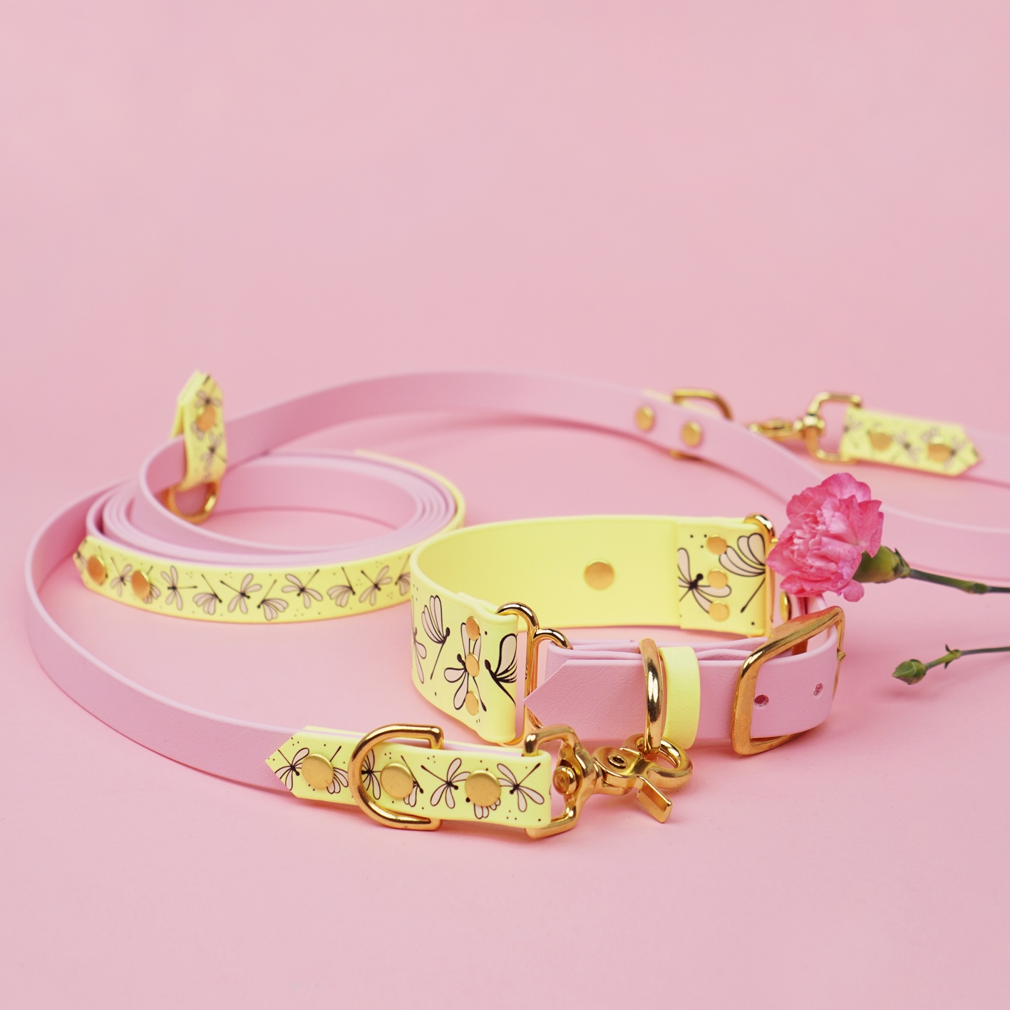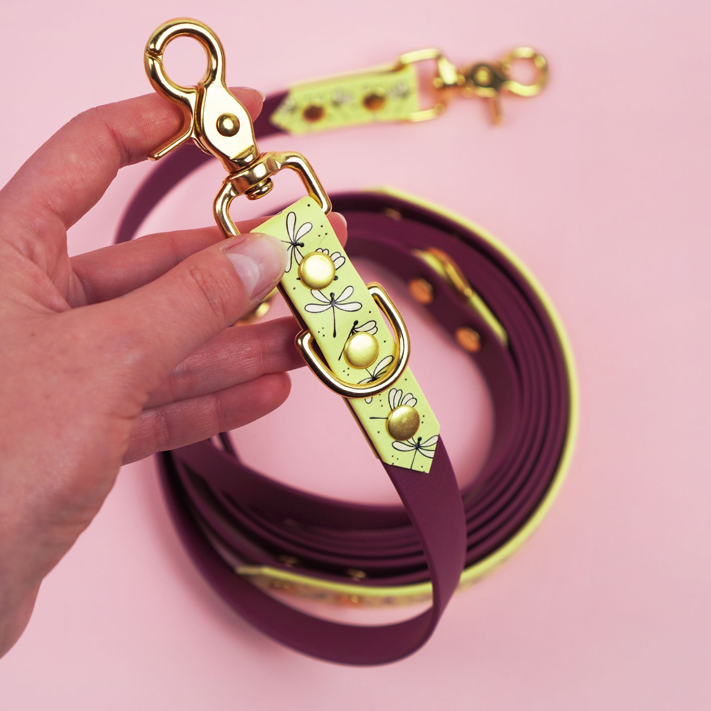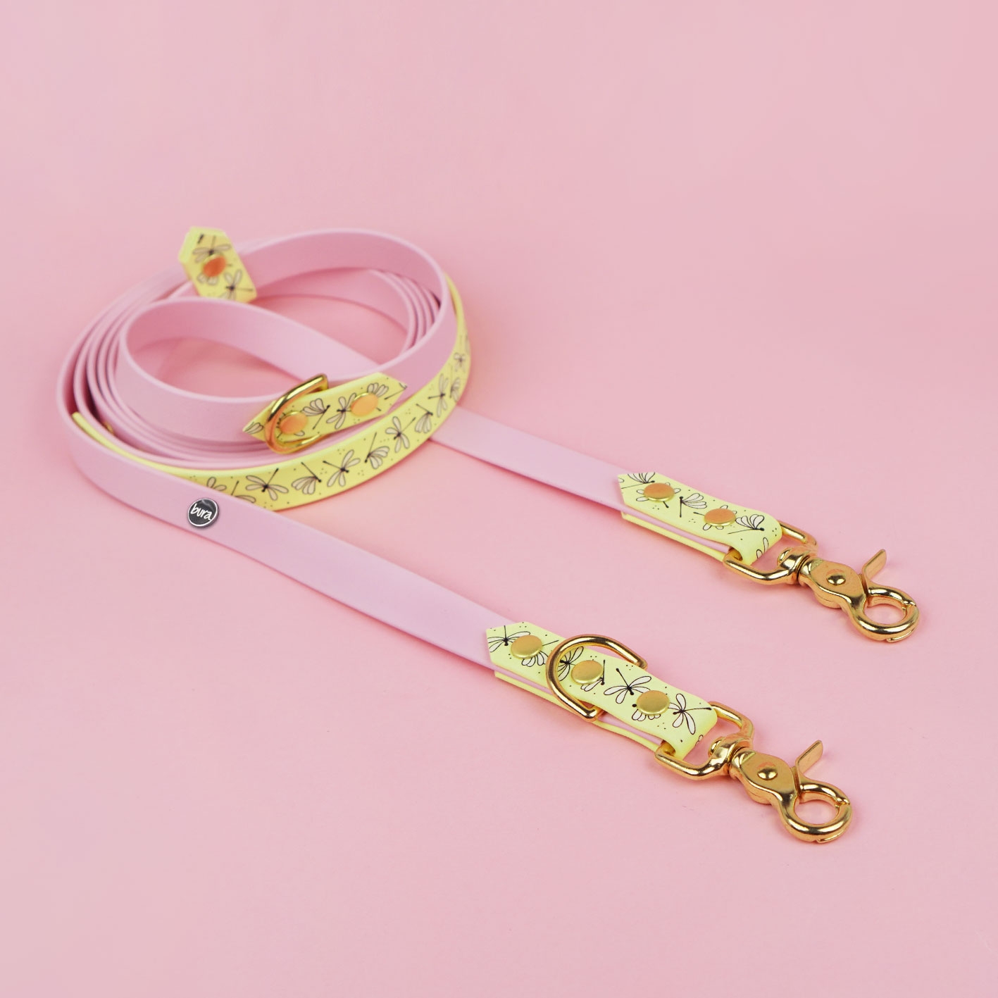 Smycz przepinana multifunkcyjna dla psa BioThane® BURA z autorskim wzorem Ważki to połączenie funkcjonalności, trwałości i wyjątkowego designu. Wodoodporna, regulowana, z opcją hands-free i rączką „traffic” – idealna do codziennych spacerów, treningu i aktywności outdoorowych. Dostępna w trzech wariantach kolorystycznych: bordowym, pastelowym żółtym i pudrowym różu.