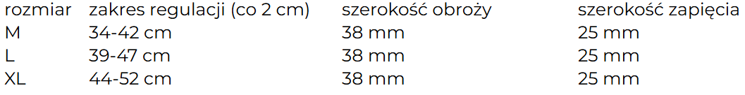 | Rozmiar | Zakres regulacji | Szerokość obroży | Szerokość zapięcia |