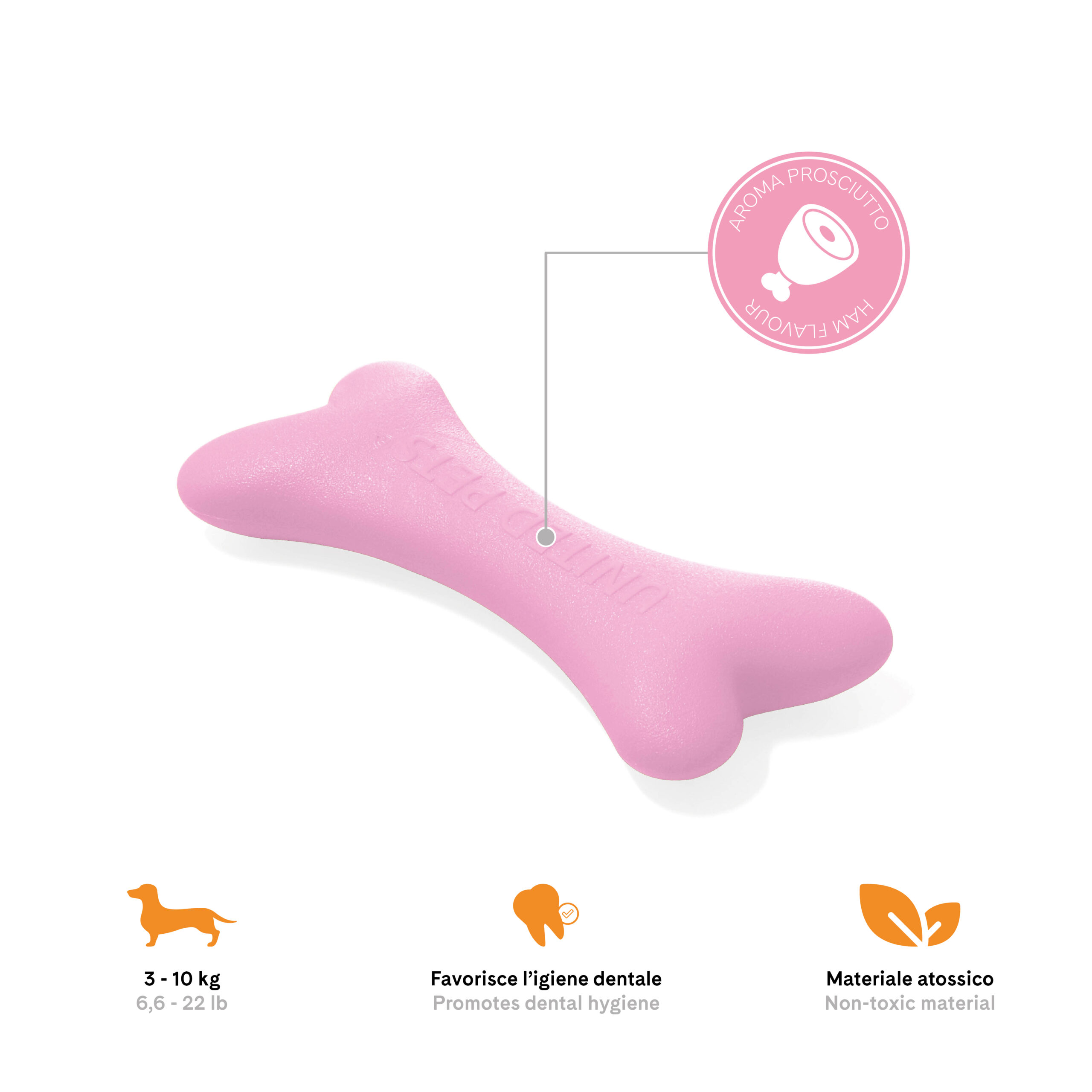 United Pets Gustosso Kość Różowa to trwała zabawka do żucia o intensywnym aromacie szynki, wykonana z bezpiecznej biożywicy. Stworzona dla psów małych i średnich ras, zaspokaja naturalną potrzebę gryzienia, wspiera higienę jamy ustnej i pomaga zapobiegać niszczeniu domowych przedmiotów. Idealna dla psów dorosłych i szczeniąt o masie 3–10 kg.